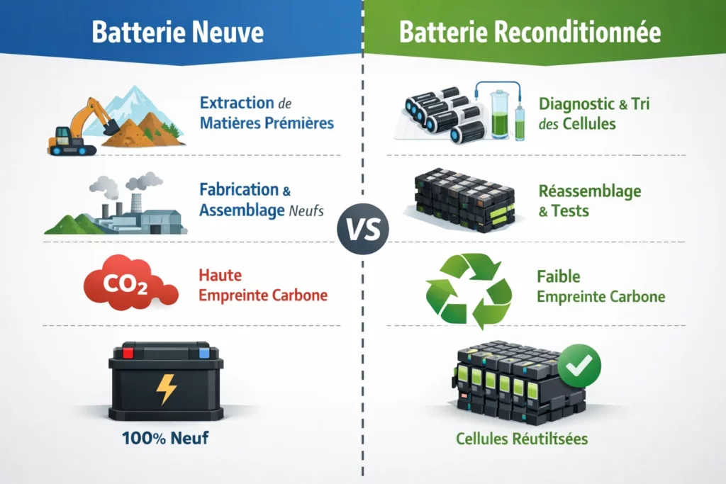 La principale différence entre une batterie neuve et une batterie reconditionnée ne réside pas uniquement dans leur origine, mais dans leur impact et leur logique de production.